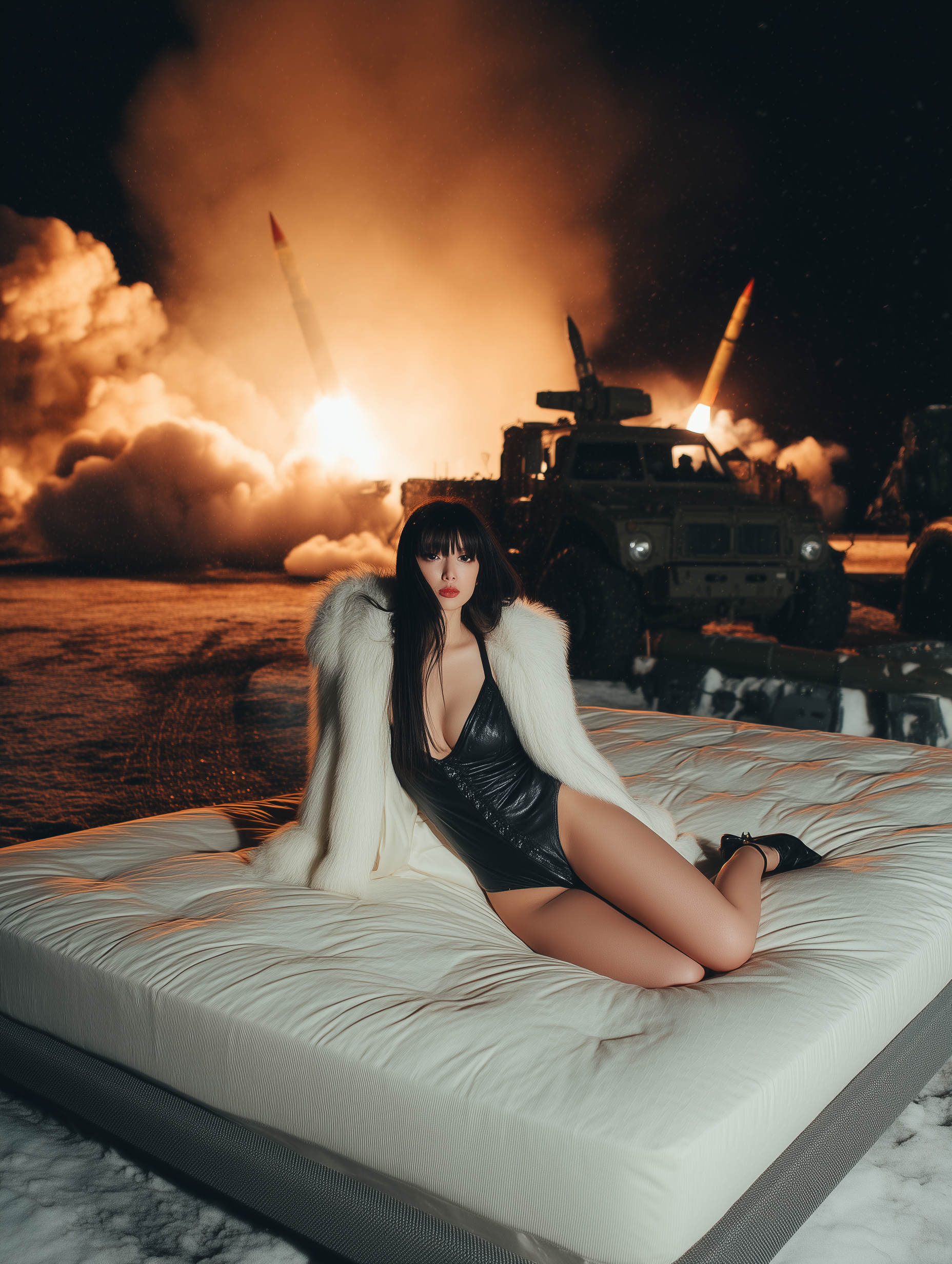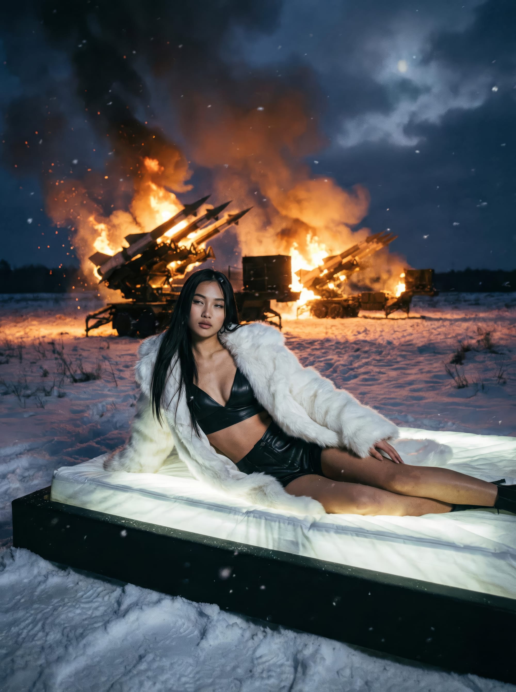 A cinematic static medium shot that transitions into a slow, orbital pan , capturing a young Asian woman reclining in an absurd, contemplative pose upon a glowing mattress in the middle of a frozen, snow-covered battlefield. In the background, heavy military missile launchers are engulfed in towering, hyper-detailed flames and thick orange smoke that billows softly into the dark, moody twilight sky. The contrast is stark: the serene, fashion-forward subject wears a luxurious white faux-fur coat and black leather attire, her expression indifferent to the chaotic, fiery destruction behind her. Tiny embers and snowflakes drift through the air in slow motion, catching the dual light of the flickering fire and the ethereal white glow emanating from beneath the bed. The scene blends the haunting, staged suburban surrealism of Gregory Crewdson with the high-fashion, satirical hyperrealism of David LaChapelle. The camera maintains a sharp focus on the textures of the fur and the woman’s skin, while the background fire remains a beautifully blurred, bokeh-filled source of warm light. This scene is captured with a Sony A1 II and a Sony FE 24-70mm f/2.8 GM II lens, using settings of ISO 400, f/2.8, and a 1/250s shutter speed to preserve the crispness of the drifting snow against the low-light environment