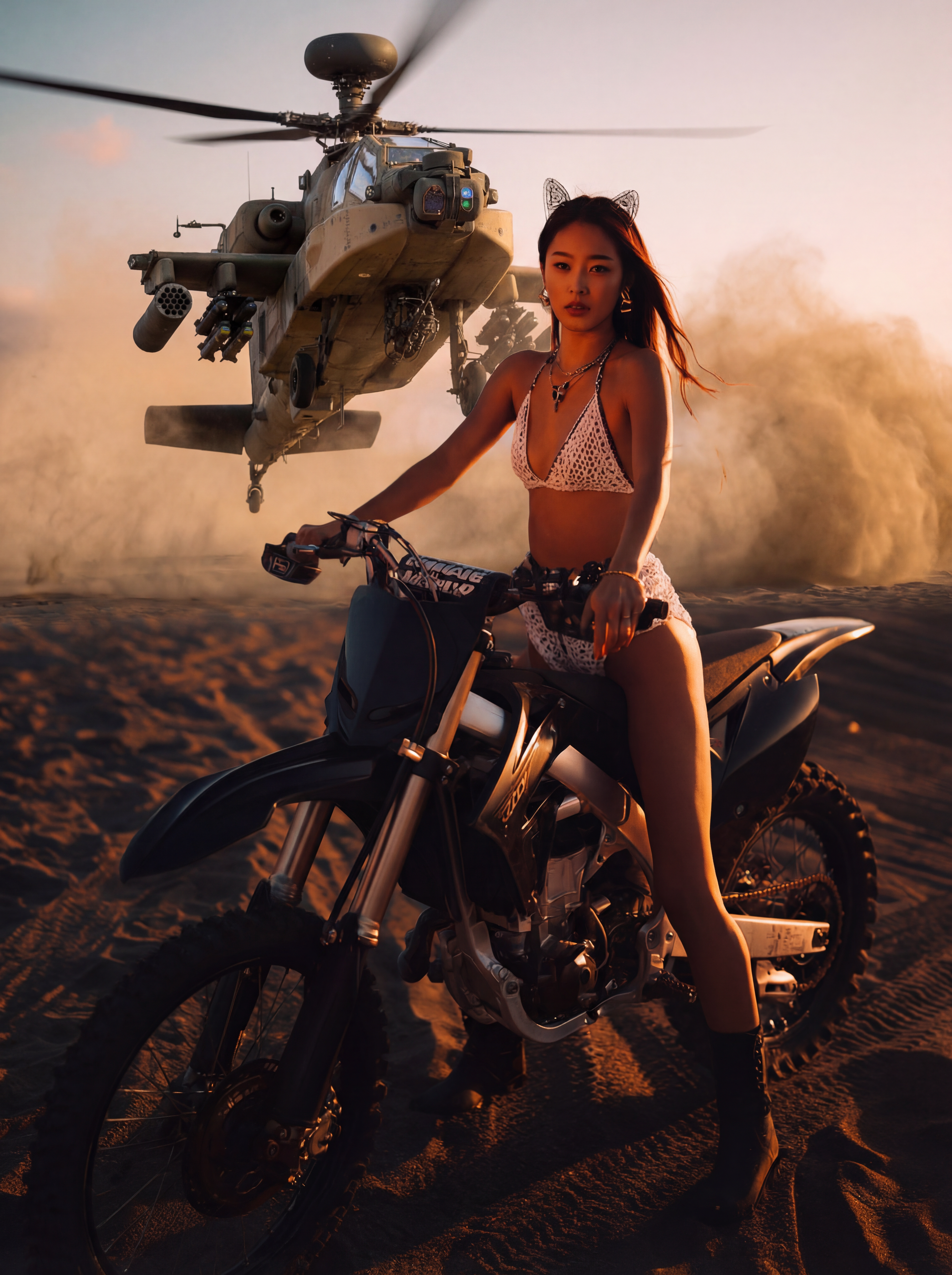 Subject & Wardrobe: A beautiful Korean woman caught mid-ride on a black motocross dirt bike, tearing across the wet sand — close-up action shot framed from the waist up or mid-thigh up, we are riding alongside her, in the action with her. Sand spraying from the rear wheel visible at the bottom of frame. She is positioned clearly in front of the helicopter's dust cloud, well-lit by the low dusk sun from the side, maintaining full visibility and separation from the background chaos. She wears a black and white two-piece swimwear set — a black triangle top with white trim and a matching black bottom — layered with a long cream-white open-front crochet cover-up billowing behind her in the wind. Gold hoop earrings, a delicate gold pendant necklace. On her head she wears a cute oversized cat-fox ear headband — plush pointed ears standing upright, Japanese cosplay-kawaii style, playful and absurd against the military backdrop. Her long dark hair flows freely, streaming behind her in the wind. Her face is clearly visible and prominent in the frame — composed, editorial calm, eyes focused ahead. Dynamic riding posture, hands gripping the handlebars, body leaning into motion. We can see details on her skin, the wind pulling at her clothes, the tension in her grip.