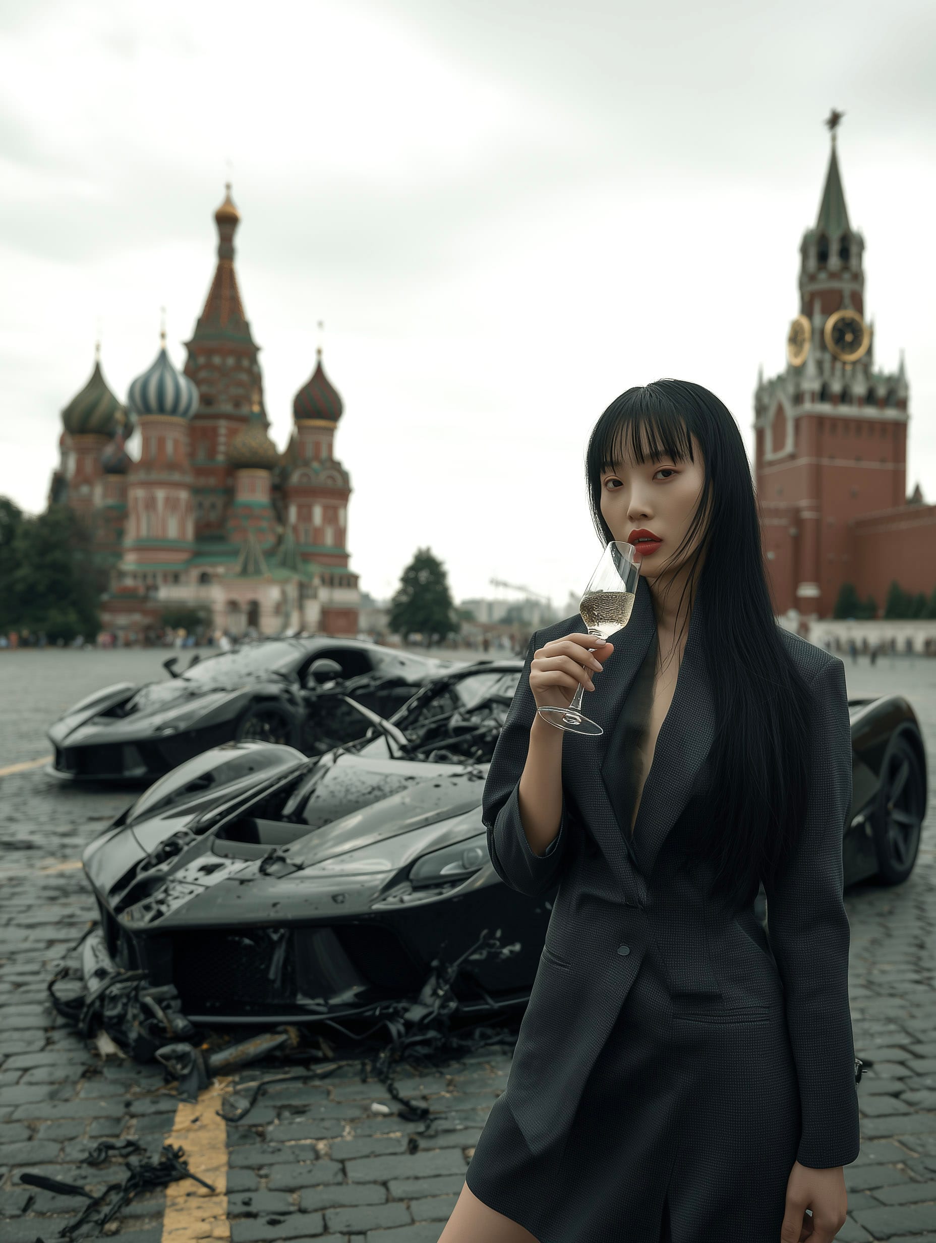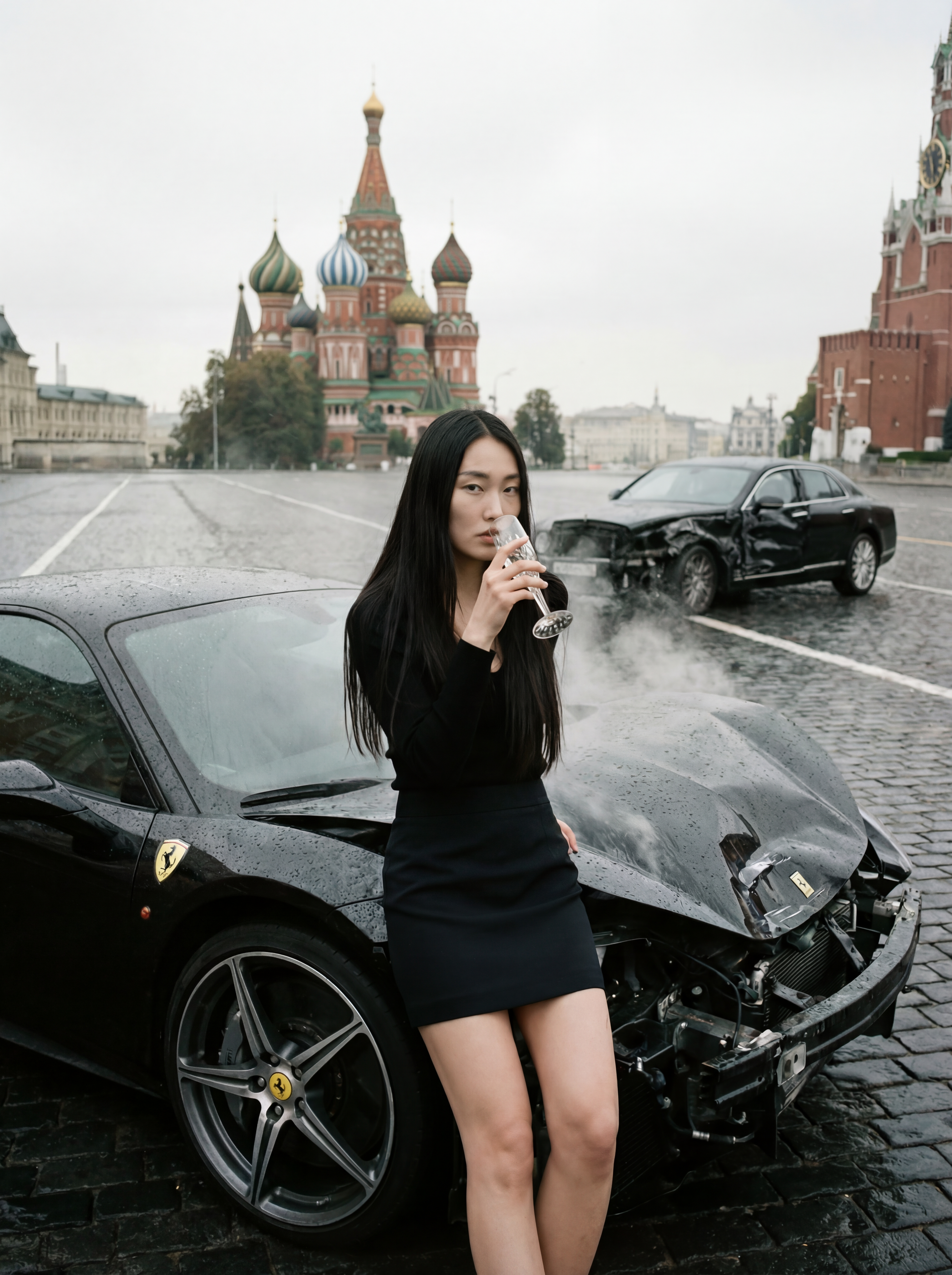 Camera orbits right and performs a slow dolly in: a young Asian woman stands in the deserted, empty Red Square in Moscow, with no one else in sight. She is sipping champagne from a delicate glass with a look of total apathy. In the background, another wrecked luxury sedan sits on the wet, dark cobblestones, with the iconic colorful domes of Saint Basil's Cathedral rising through the grey, overcast mist. The lighting is diffused and flat, emphasizing the gritty realism of the accident against the absurd luxury of the moment. The visual style draws from the raw, intimate documentation of Nan Goldin and the highly stylized, cinematic narratives of Alex Prager. The scene is captured with a Nikon Z9 and a Nikon Z 24-70mm f/2.8 S lens, shot at ISO 200, f/2.8, and 1/250s to ensure every detail of the shattered glass and wet pavement is rendered with hyper-clarity.