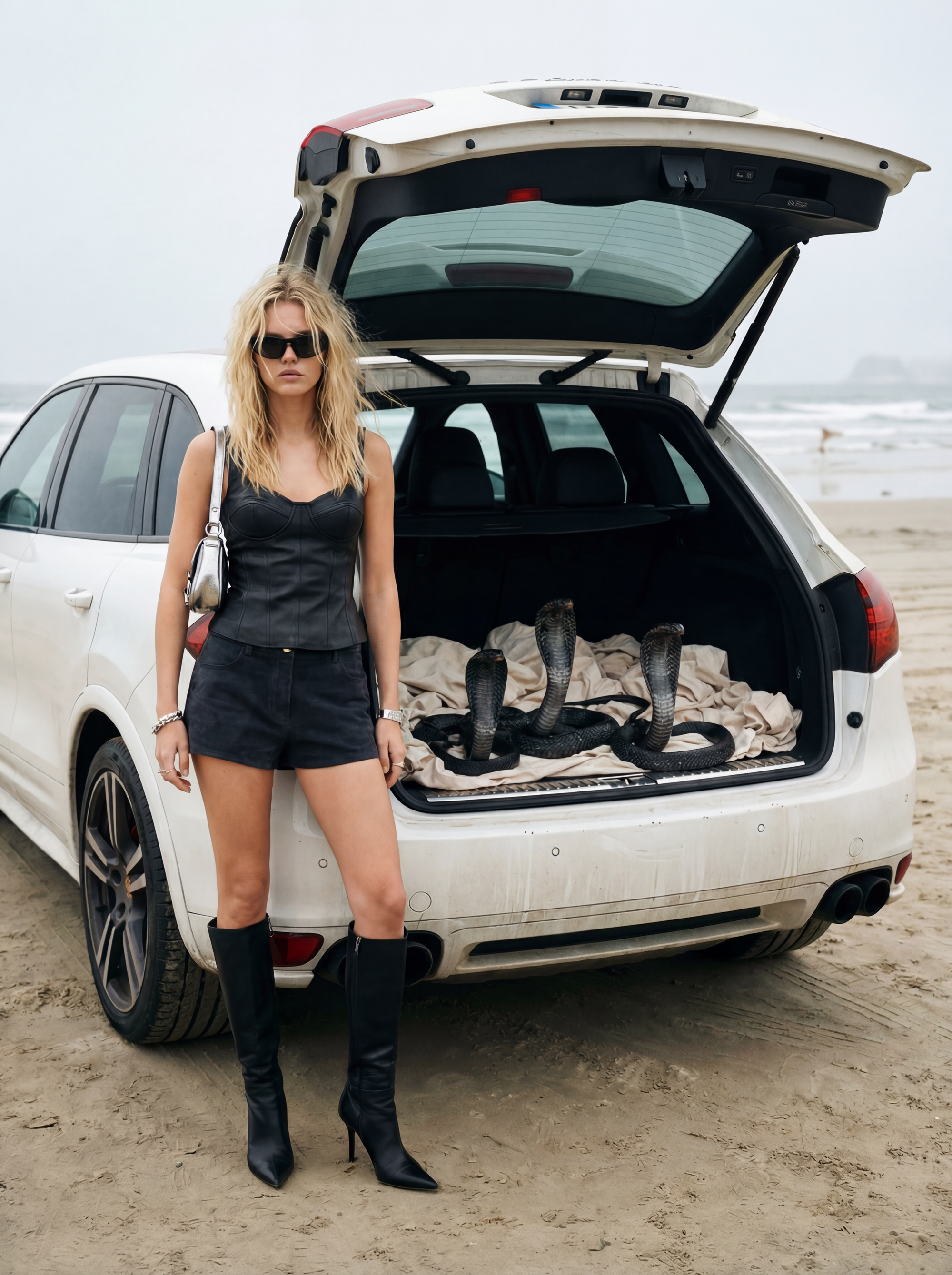 Scene: Our model, a splendid Swedish young woman with mid-long beautiful blond hair, stands near a white Porsche Cayenne GTS parked in on a beach with the ocean in the background. The rear door of the Porsche is open, revealing four huge black royal cobras calmly standing inside the trunk area, resting on light fabric. The scale is realistic — the cobras are large, heavy, and physically believable, not stylized.