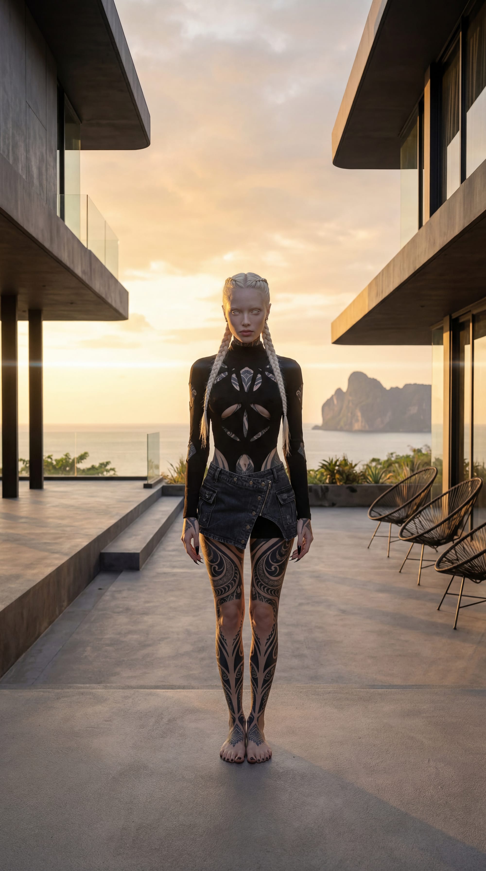 She stands in the middle of the terrace. No palm trees. She is barefoot, with black nail polish on her toes. The sea in the background. Natural light, professional photography, cinematic still. 8K details. Shot with RED V-Raptor + Hawk V-Lite Anamorphic 35mm at f/2.8, ISO 400, sharp, anamorphic.