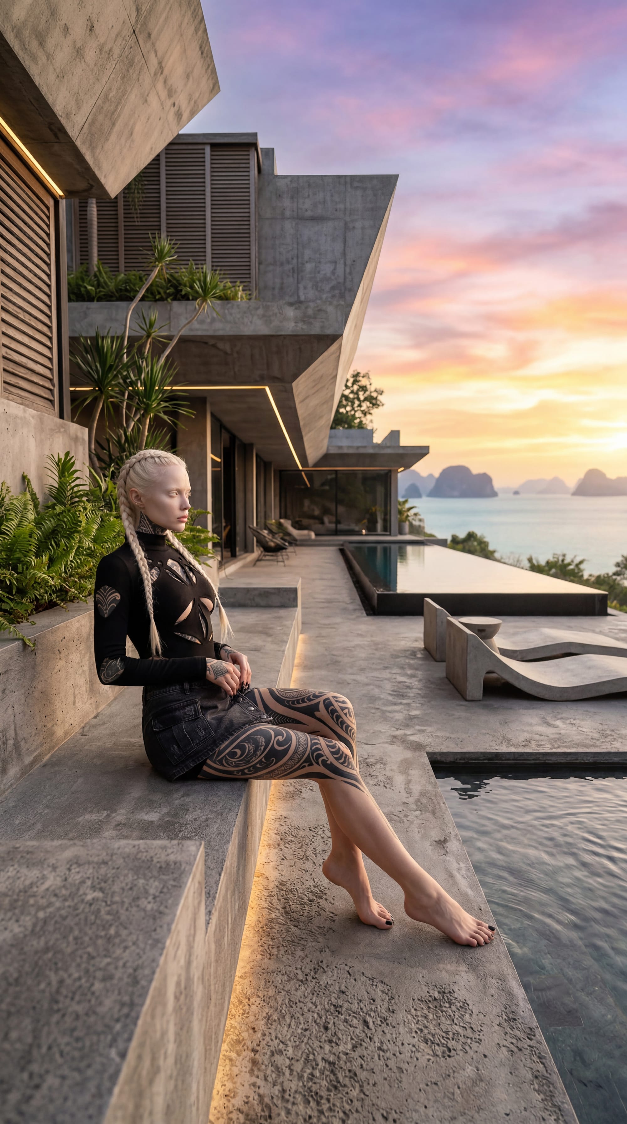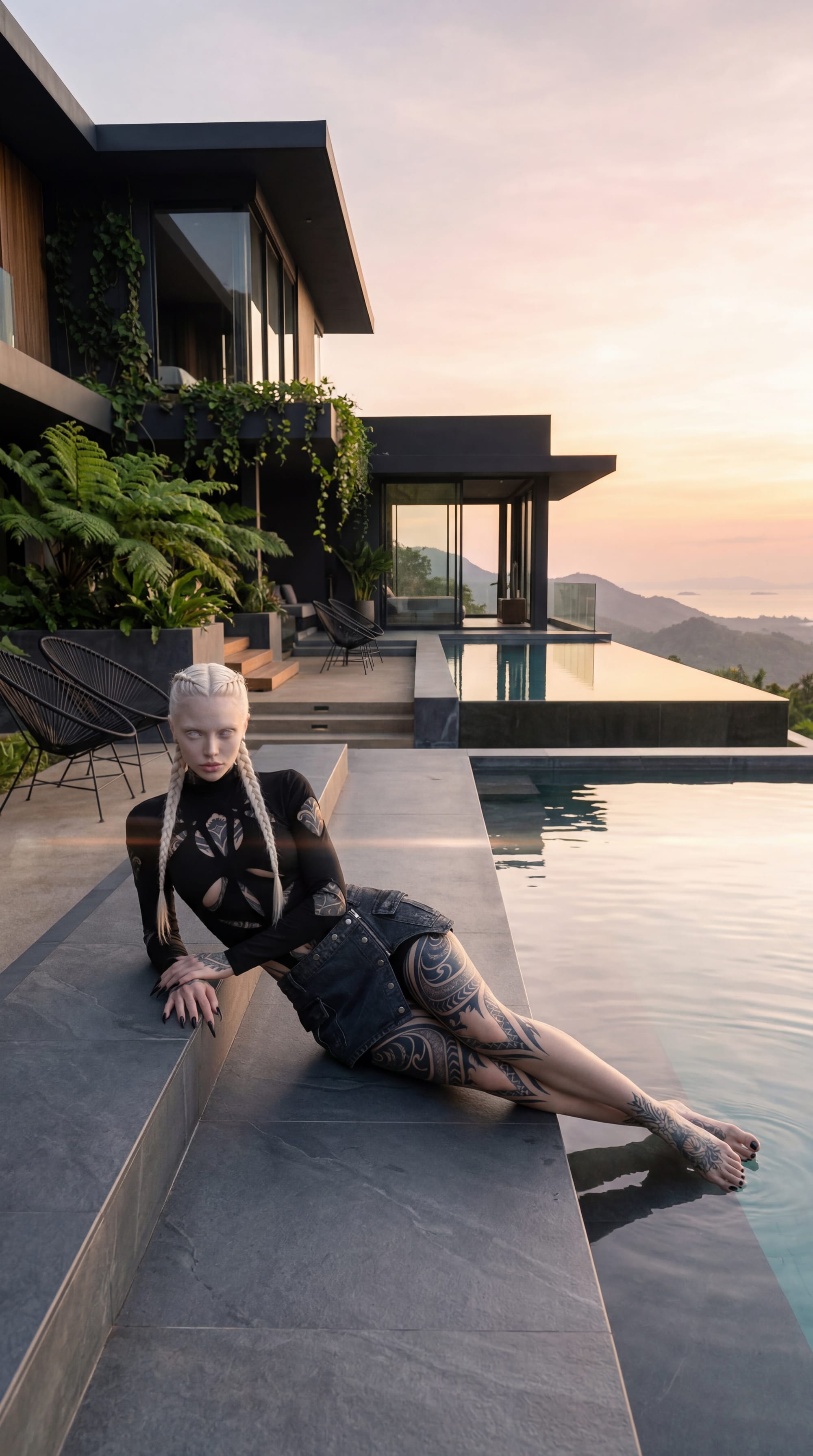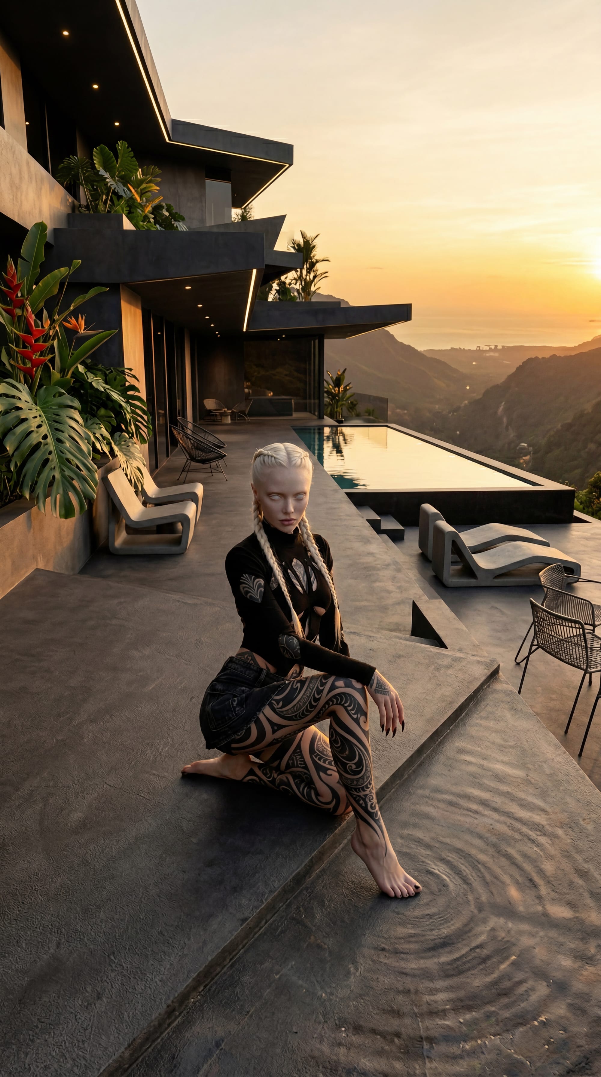 Medium shot of my character on a breathtaking terrace in Thailand at golden hour, the surrounding villa is inspired by BUT DIFFERENT from (Provide image reference of the Villa if you have one).